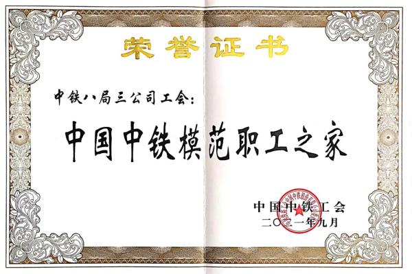日前,公司工会被中国中铁工会授予“中国中铁模范职工之家”荣誉称号,这是公司工会继获贵州省“模范职工之家”、中铁八局“模范职工之家”、贵州省“安康杯”竞赛优胜单位和优秀组织单位之后的又一殊荣。