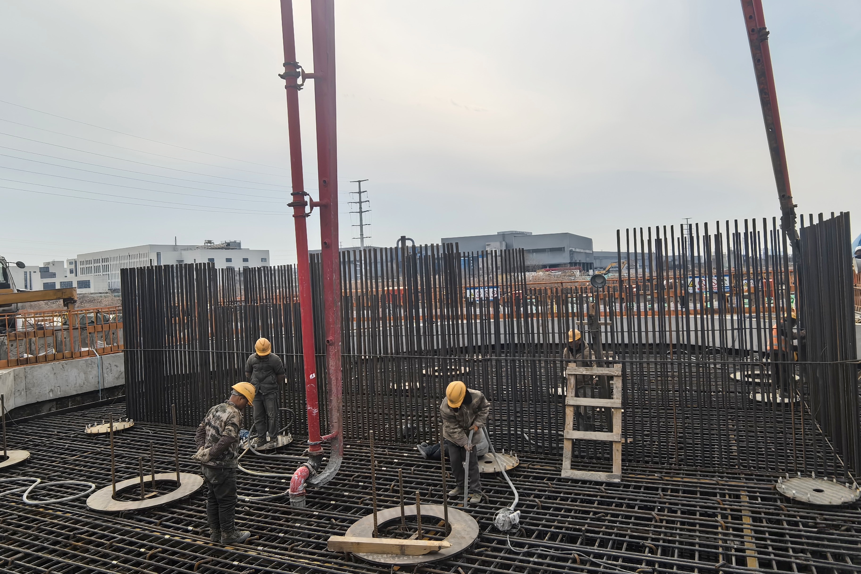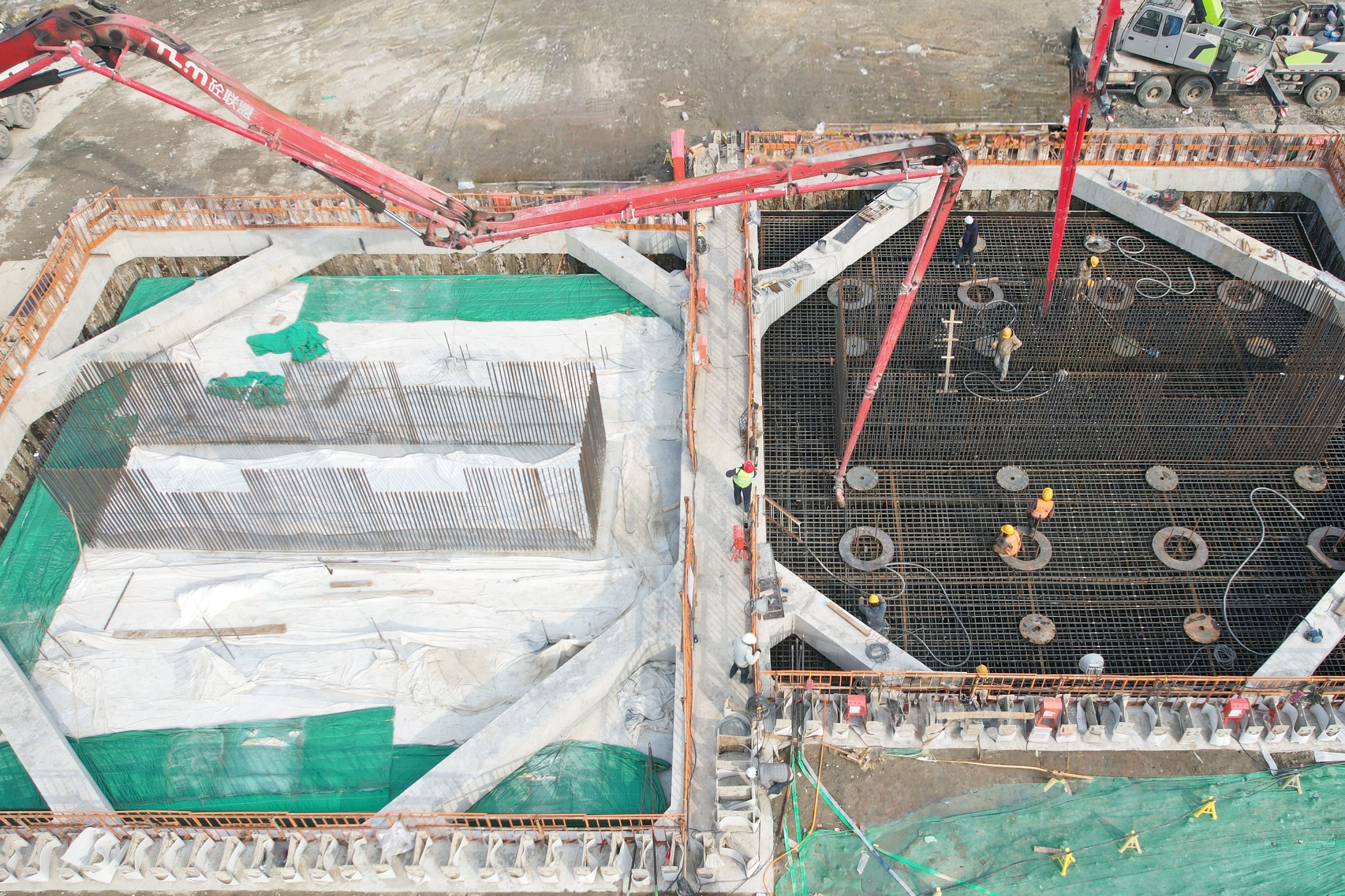 针对基坑紧邻锡澄运河,地质条件复杂,存在较厚淤泥质软土层,力学性能差,且地下障碍物较多,项目团队动态优化方案,将原设计水泥搅拌桩变更为引孔结合高压旋喷桩的工艺,有效穿透并加固了不良地质,确保了支护体系的稳定可靠。面对施工现场毗邻省道惠暨大道的交通压力,通过改造交叉口、设置专职交通疏导员24小时值守等措施,实现施工与交通通行的平衡。为破解大体积混凝土温控防裂难题,在承台内部预埋四层冷却循环水管网,结合智能测温系统24小时动态监测调控,将混凝土内外温差严格控制在规范范围内,从根本上保障结构质量。此外,为全面提升施工过程管控水平,项目团队还对模板加固、钢筋安装等关键环节实行“清单化”核验,启用自动化监测设备实时采集位移、应力数据并预警,构筑“人防+技防”立体安全防线。