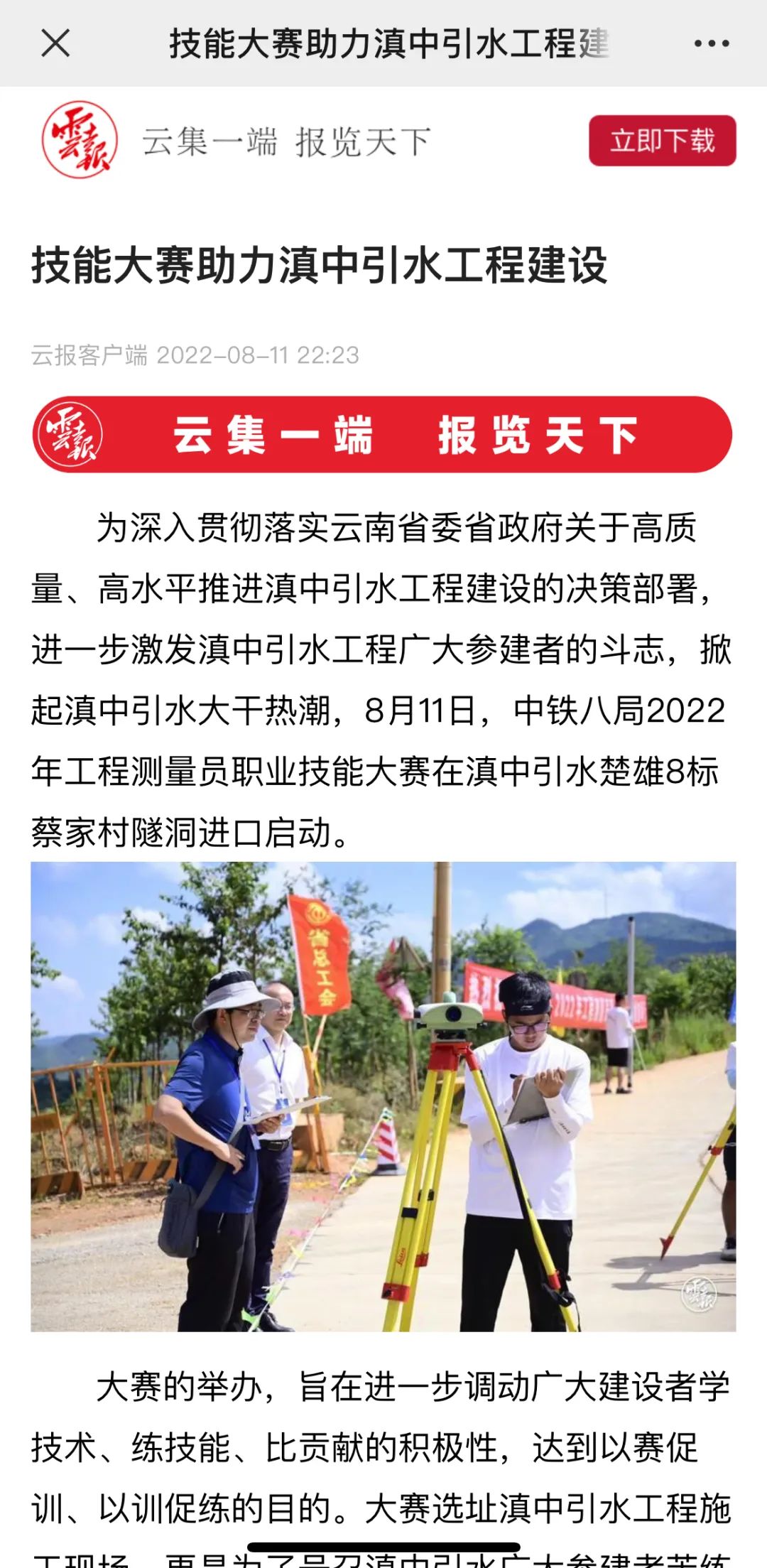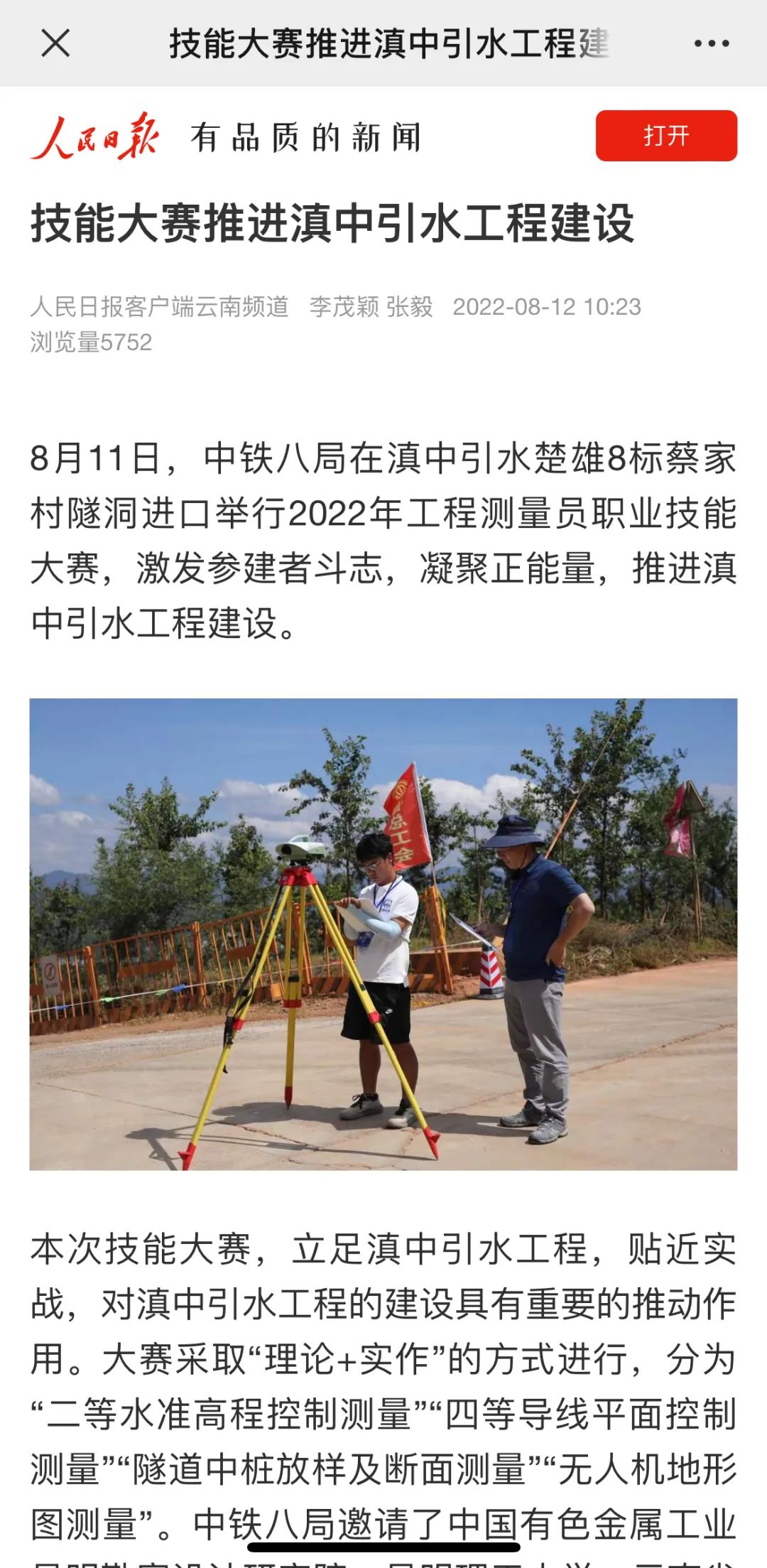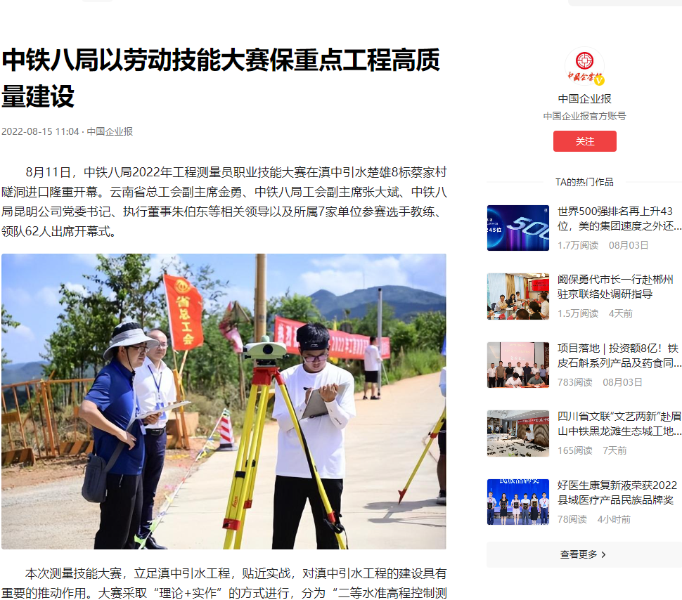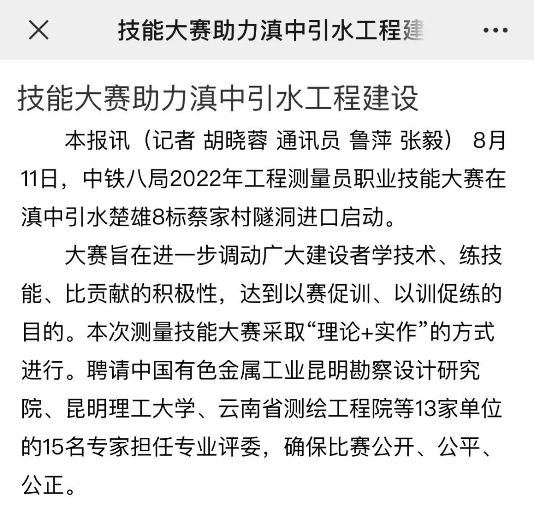 8月11日—14日,中铁八局在滇中引水楚雄8标项目举办2022年工程测量员职业技能大赛。