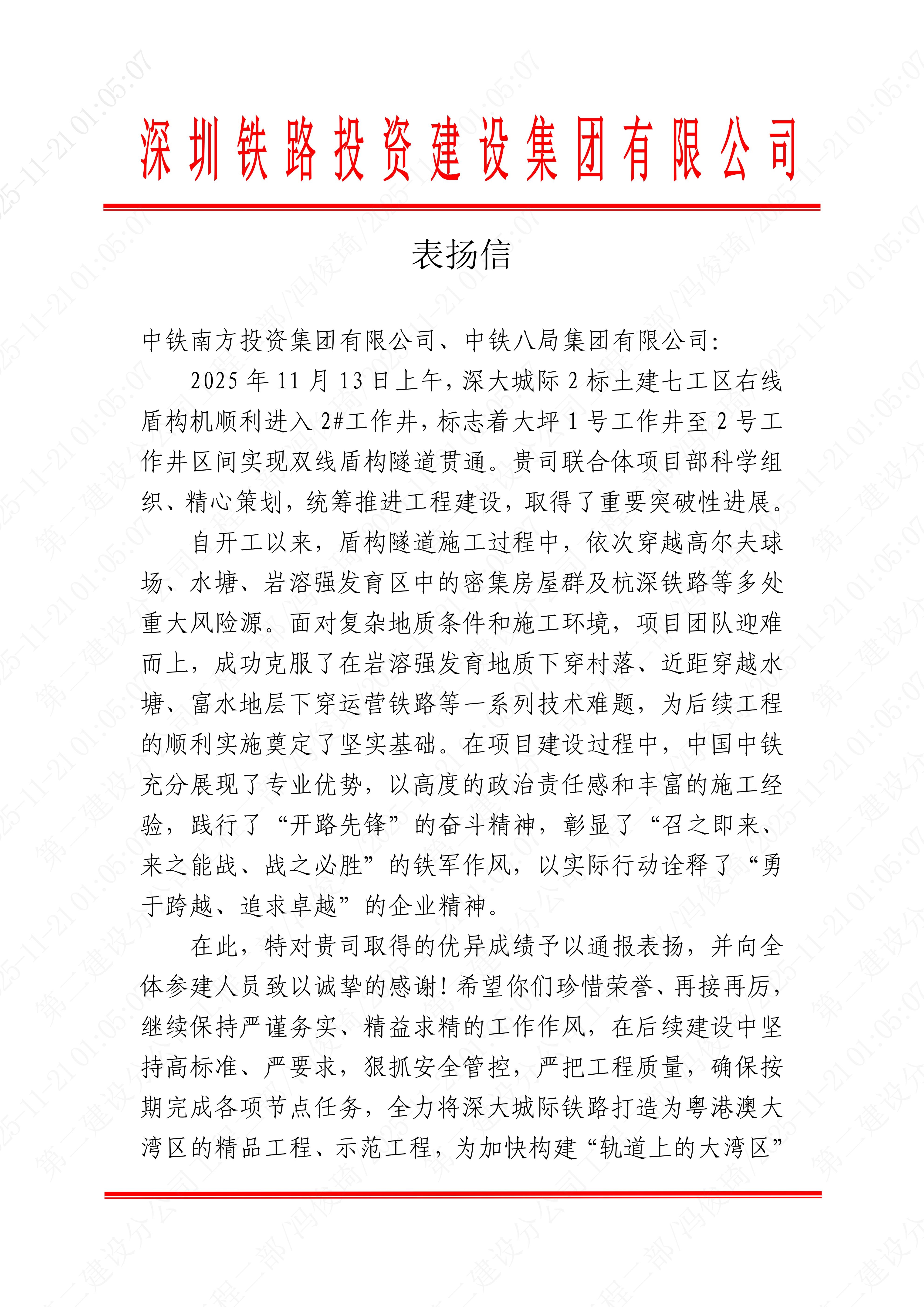 11月20日,中铁八局深大城际项目部收到来自深圳铁路投资建设集团有限公司的表扬信,对项目团队在工程建设中展现出的专业能力和责任担当给予高度认可。