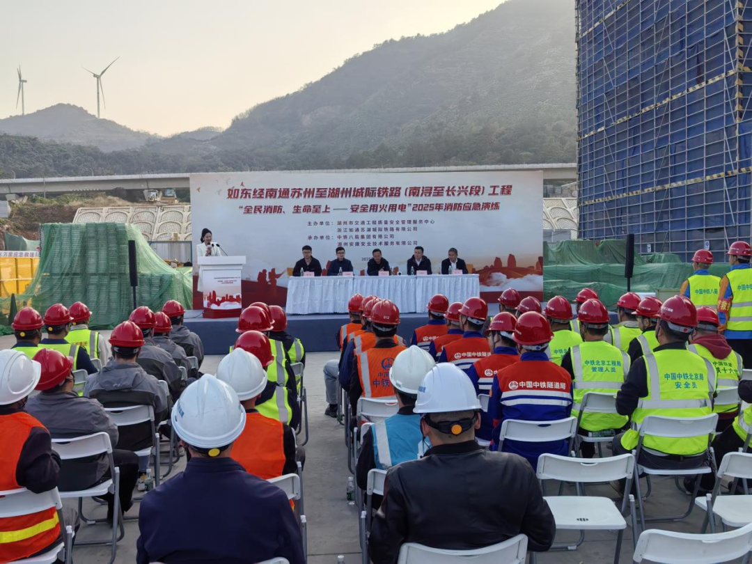 11月14日,苏湖城际项目部开展“全民消防、生命至上—安全用火用电”2025年消防应急演练活动。本次演练由湖州市交通工程质量安全管理服务中心与浙江如通苏湖城际铁路有限公司联合主办,中铁八局承办,各参建单位人员参加。
